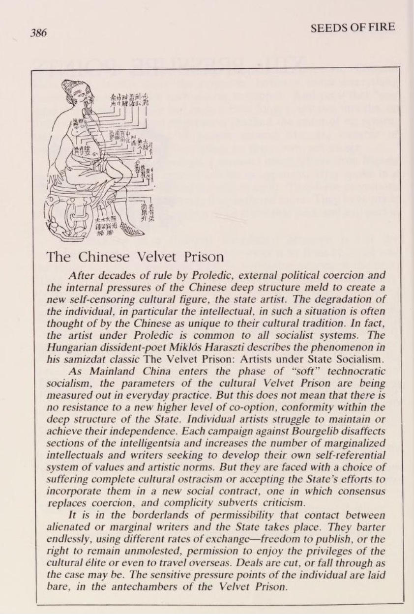 你會注意到,我1999年出版的《赤字之中In the Red》第一章「中國的天鵝絨監獄」(The Chinese Velvet Prison)借鑒了匈牙利異議人士米克洛斯·哈拉斯蒂(Miklós Haraszti)的思想。他首次出現在我的作品中是在1988年。當時,我們在《火種:中國的良心之聲》(Seeds of Fire: Chinese Voices of Conscience)的美國版(首版於1986年在香港出版,擴充的第二版於1988年由紐約出版社發行)中,提到了哈拉斯蒂的新書《天鵝絨監獄:國家社會主義下的藝術家》(The Velvet Prison)。我要指出,是我的導師皮埃爾·里克曼斯(Pierre Ryckmans,筆名Simon Leys),在1987年初向我介紹了哈拉斯蒂的著作,他在本科階段教我中文,後來是我的博士導師。(譯者註:關於Pierre Ryckmans (Simon Leys),更多介紹請參見:《一個正直的人One Decent Man》,這是白杰明撰寫的書評,發表於2018年6月28日的《紐約書評》(The New York Review of Books),評論Philippe Paquet的的Simon Leys傳記《Simon Leys: Navigator Between Worlds》。這篇文章回顧了比利時漢學家皮埃爾·里克曼斯(Pierre Ryckmans,筆名Simon Leys)的學術與人生歷程,聚焦於他對中國古典文化與毛澤東時代政治的犀利批判。在評論中,Barmé反思了自己作為Ryckmans學生經歷,回顧了他們在中國動盪的1970年代的通信,並強調Ryckmans如何利用漢學洞見揭露毛政權的威權本質。這篇評論不僅讚揚了Ryckmans的正直和學術貢獻,還強調了他對當代中國研究者的持久意義。]