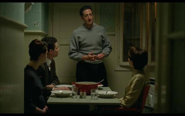 这种认知不止体现在电影语言创意上,纵览全片,你不难看出其中的“致敬”元素,且不说他对复古胶片的使用,单是拉斯洛表兄带其回居所那段戏的色调与美工造型,足以让你穿越到“教父”里了。